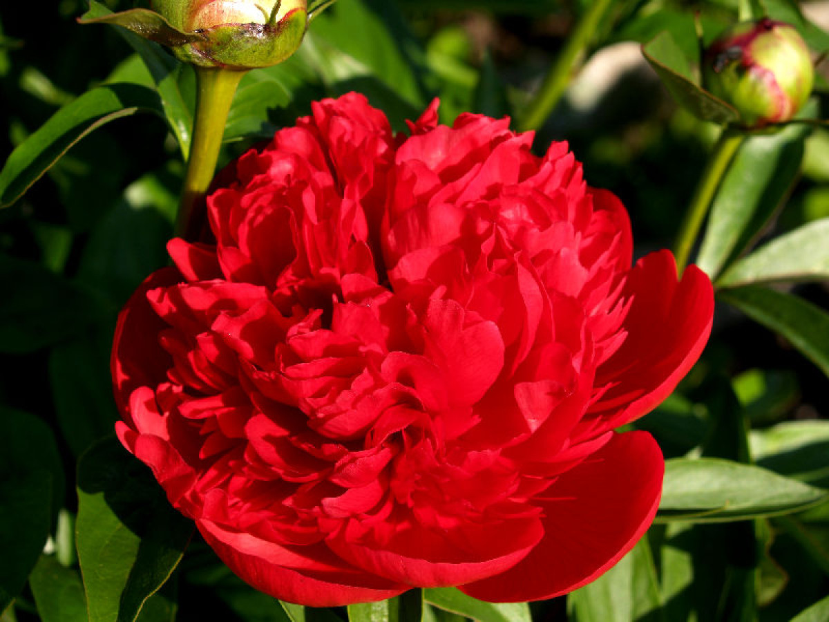 Bockstoce W., 1955, США. Травянистый. Гибрид. Цветок густо махровый розовидный с бутоном в центре, напоминает сверкающе тёмно-красную розу с многочисленными лепестками плотной текстуры. Стебли толстые, прочные. Листья слегка морщинистые светлые, яркие, с оттенком жёлтого. Тычинки отсутствуют. Пестики отсутствуют. Цветок крупный Ф=20 -22 см. Высота куста Н=90 см. Ранний срок цветения. Постоянный фаворит выставок!