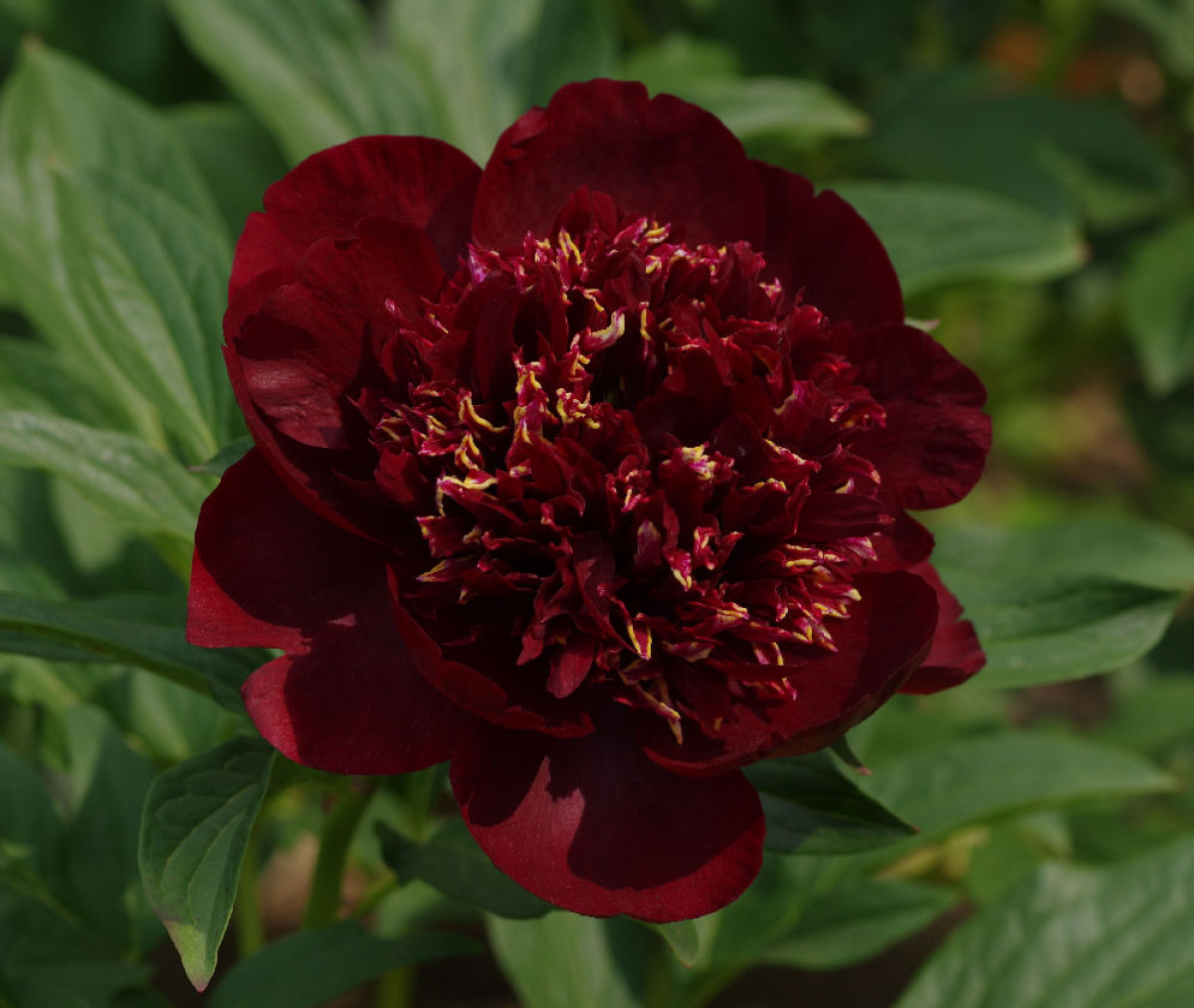 Auten, 1939, США. Гибрид пиона лекарственного. Форма японская - полумахровая - махровая, может быть и простой на тонких стеблях. На одном кусте в течение сезона бывают цветки разных форм. Диаметр цветка 16 см. Цветок тёмно-красно-коричневый без фиолетового насыщения. Стаминодии крупные, многочисленные с золотистой каймой. Высота куста 60-70 см. Стебли изгибаются. Листья широкие , округлые, насыщенно-зелёные, без блеска. Ранний. Аромат слабый, приятный.
