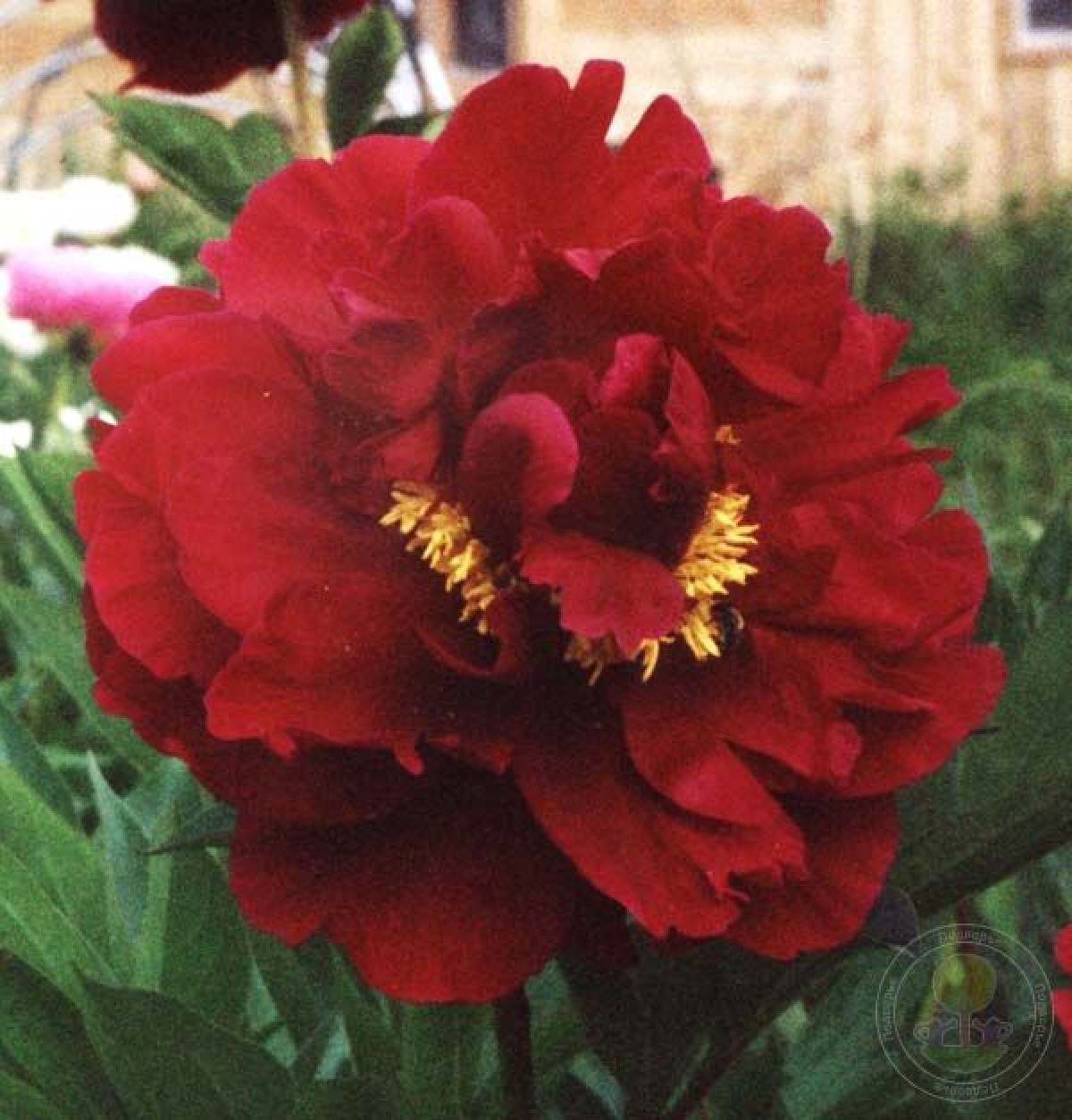 Уайльд, 1950, США. Происходить от пиона молочноцветкового. Форма цветка от полумахровой к махровой. Диаметр 16 см. Цвет тёмно-красный бархатистый с крупными наружными лепестками и высоким центром, окруженным кольцом ярко-жёлтых тычинок. Стебли тонкие, упругие. Куст не разваливается. Высота 75-80 см. Запах приятный, слабый. Среднераннего срока цветения.