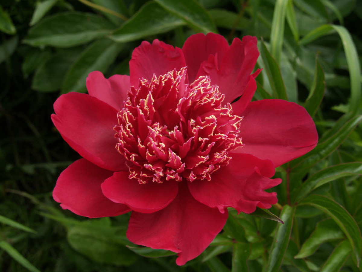 Tischler - Brand Peony Farms, 1972, США. Происходит от пина молочноцветкового. Блестящий темно-красный цветок японской формы диаметром 14 см. Наружные лепестки широкие, округлые, двухрядные, а центр состоит из широких стаминодий, края которых отмечены ярко выраженной золотистой каймой. Высота куста 85 см. Стебли прочные, куст не разваливается. Срок цветения поздний. Прекрасное растение с яркими цветами, сразу же привлекающее к себе внимание.